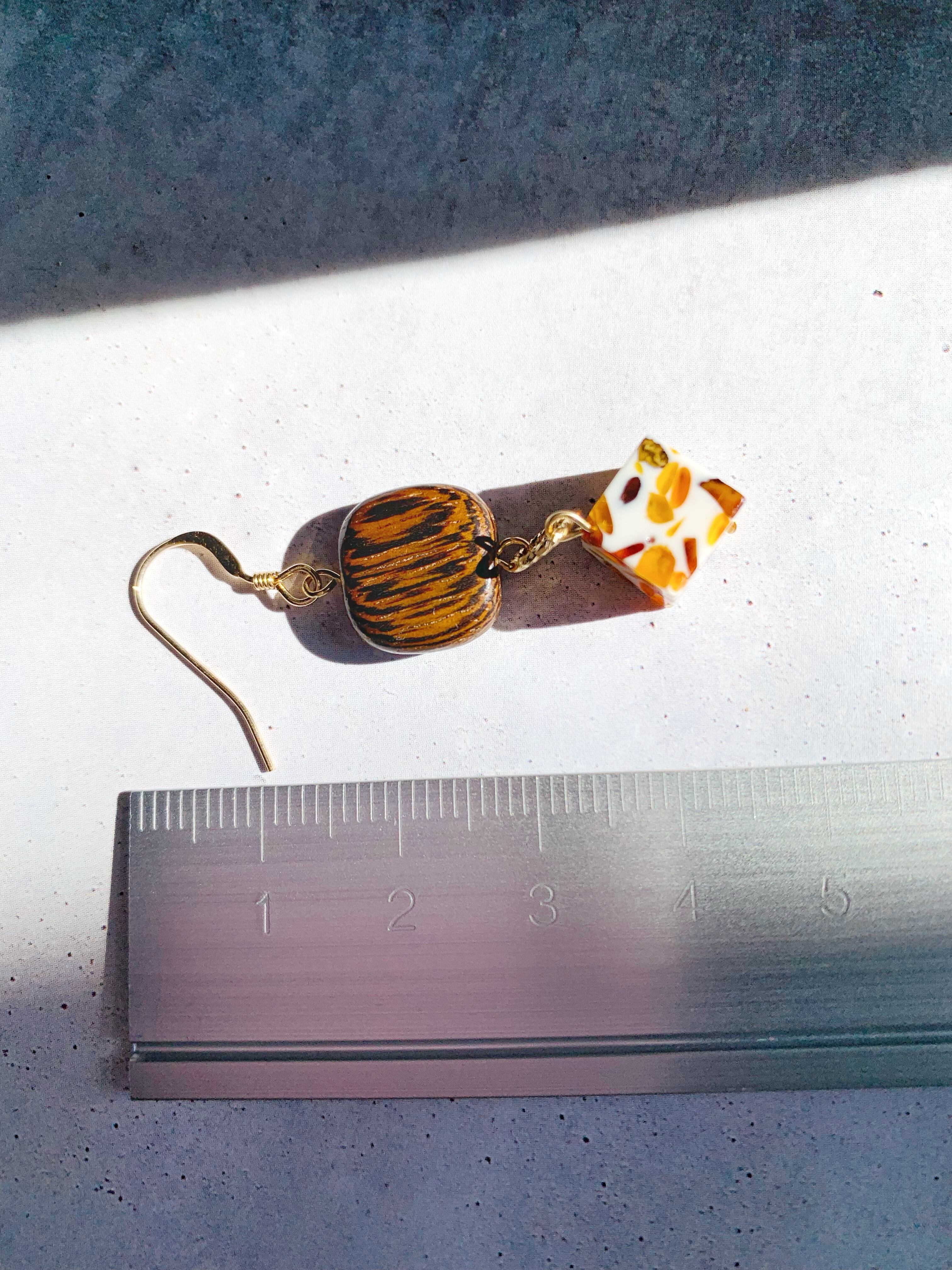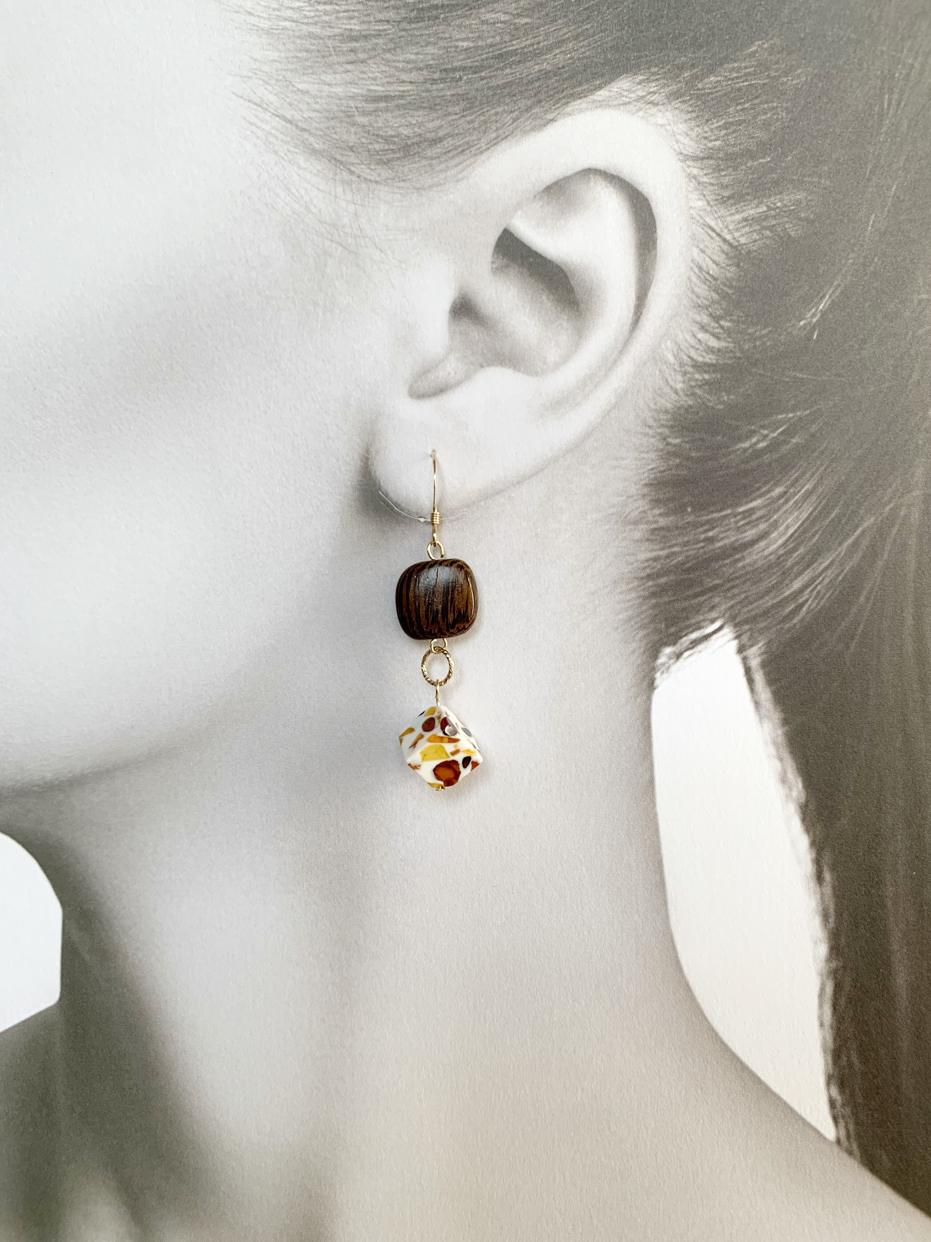 白と茶色のコントラストがが美しいアンバーにウッドビーズとゴールドを同系色で組み合わせることで、落ちつきと上品さがあるピアスは、季節を問わずお使いいただけます。