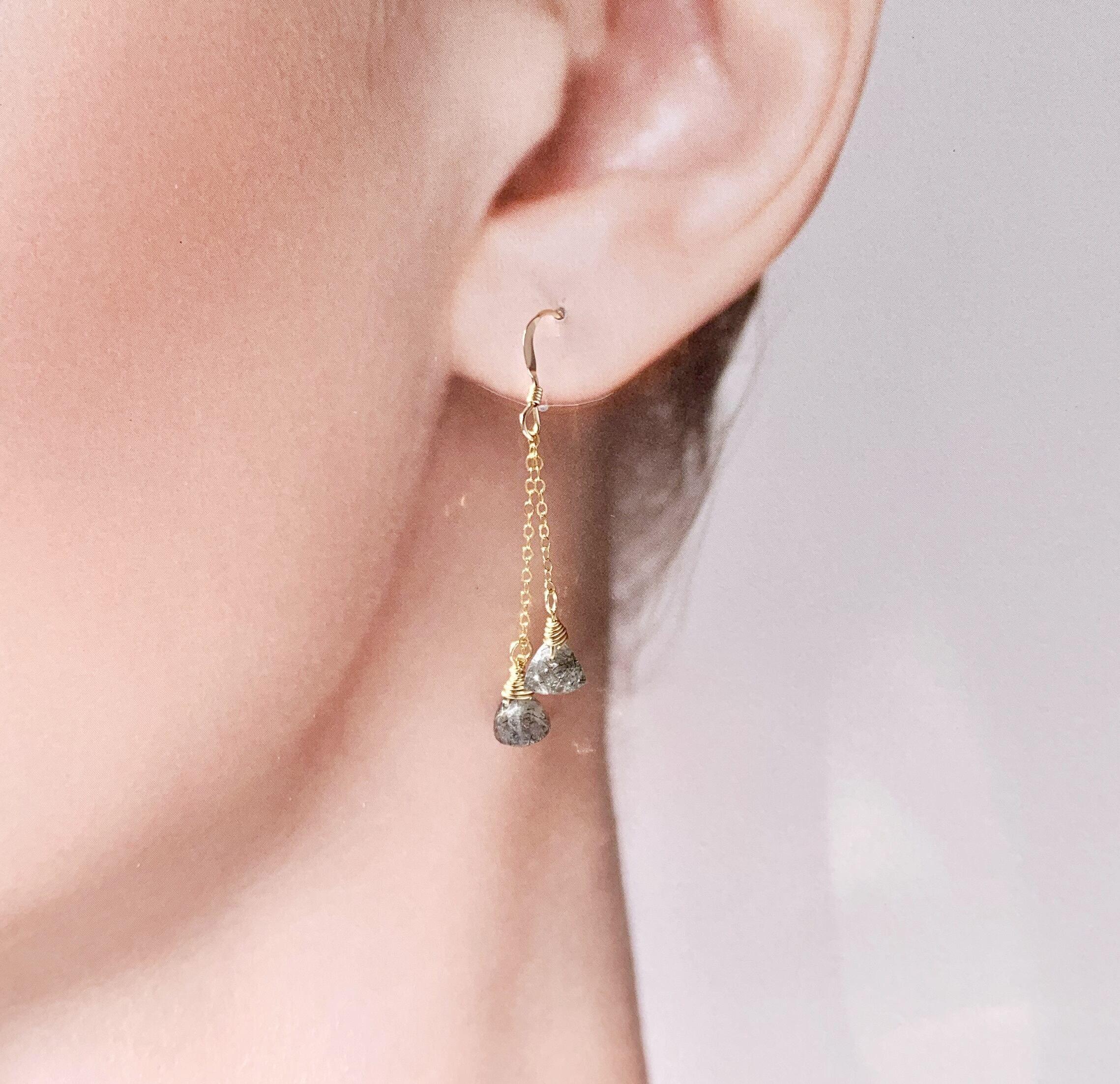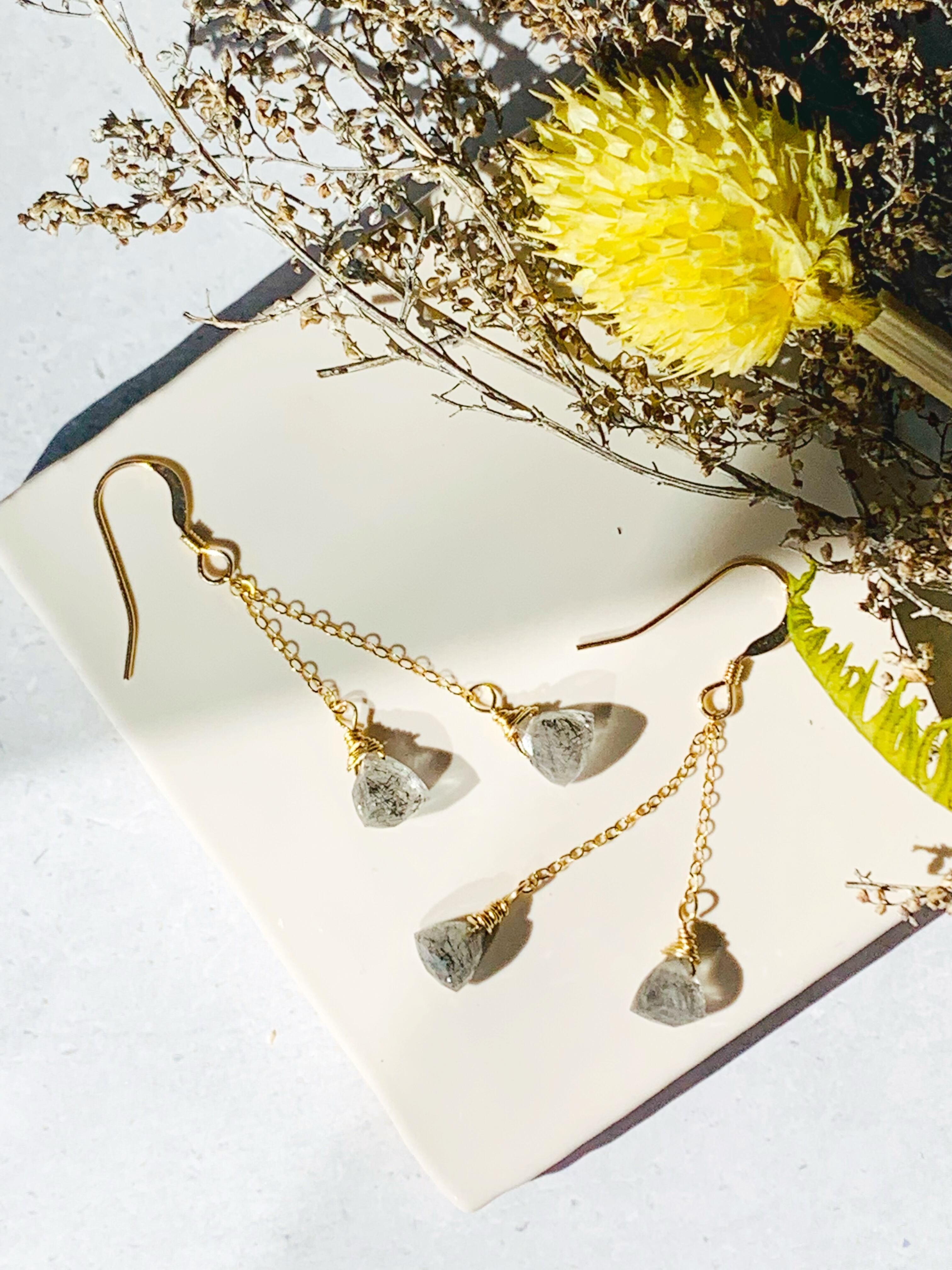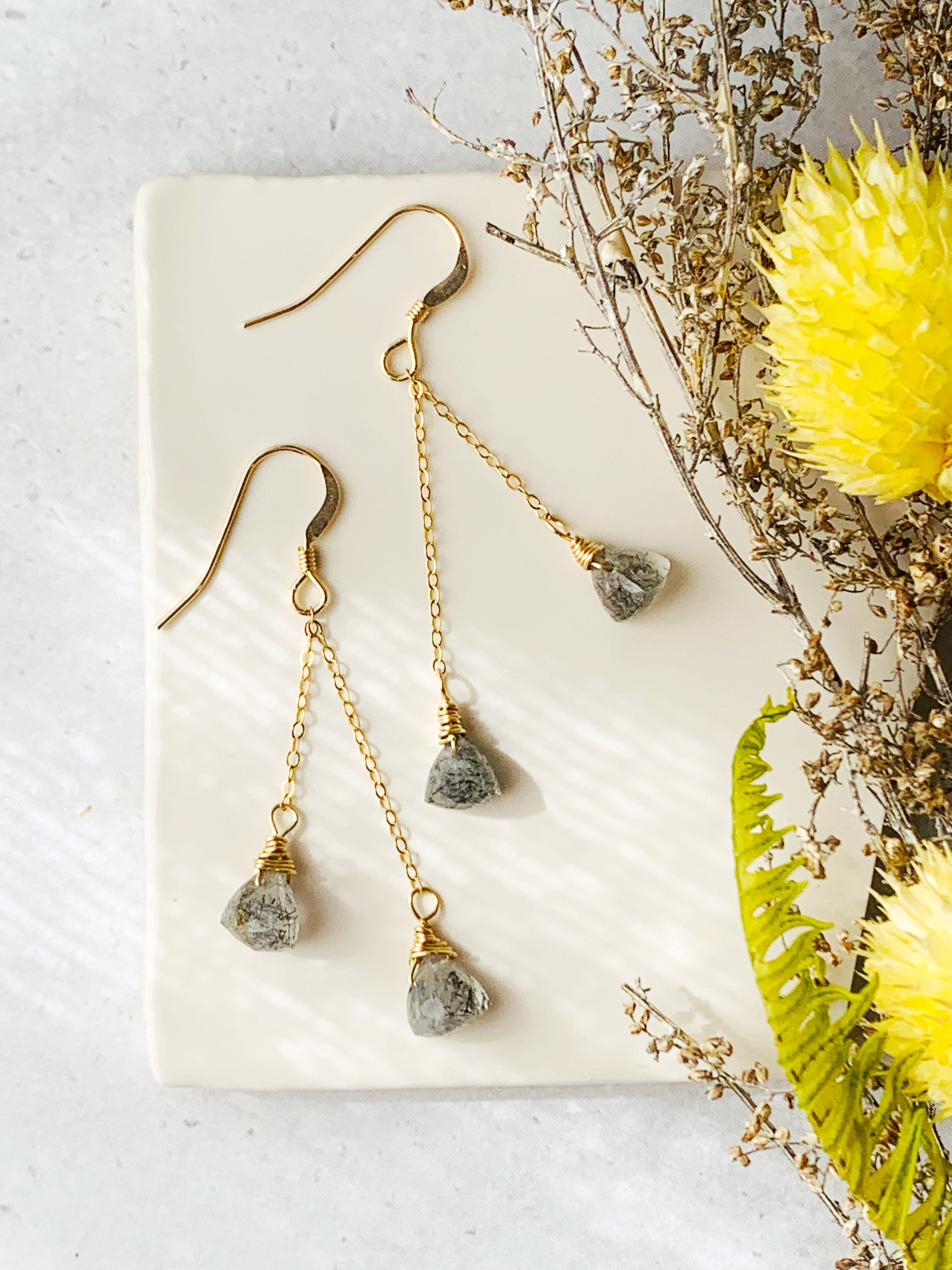 全ての面にカットが施され、どの角度からみても美しい輝きが魅力なトルマリンクオーツが揺れることで、より美しさを引き立てるデザインにしました。