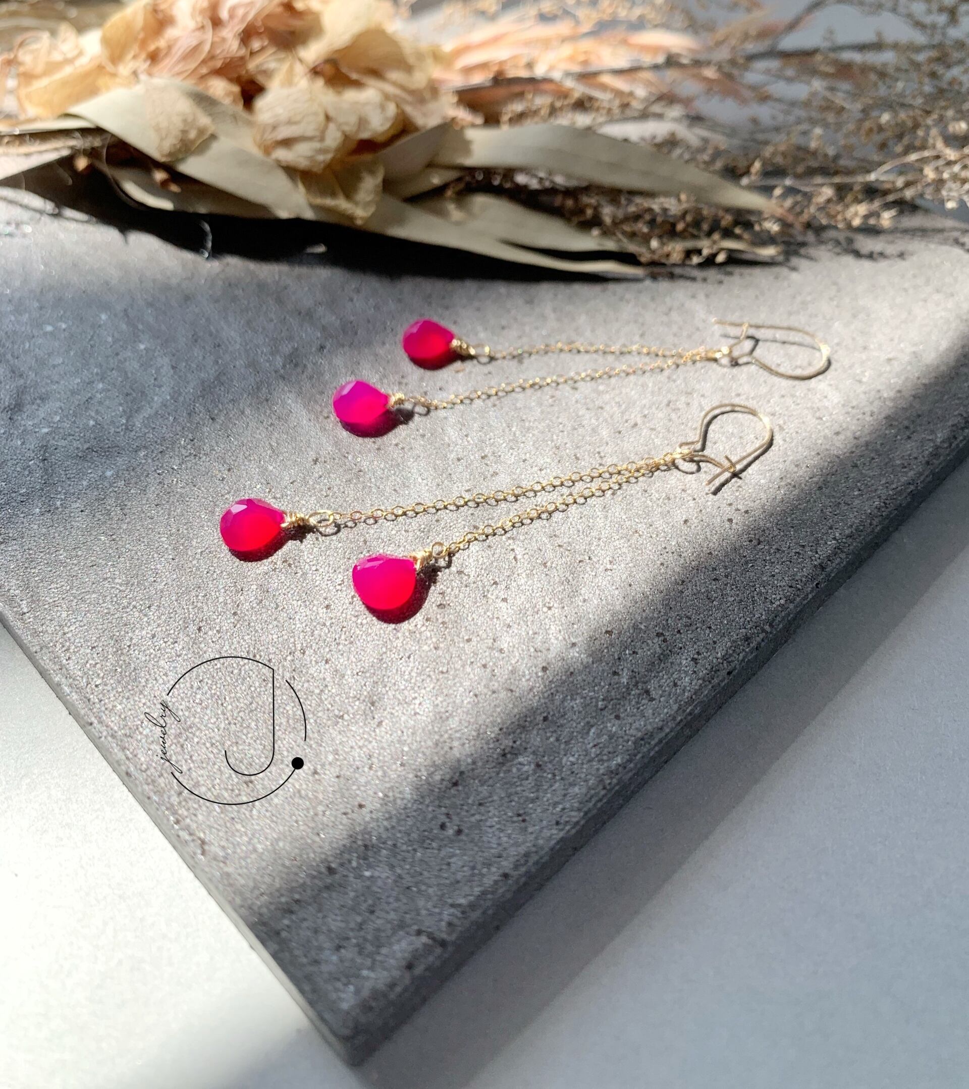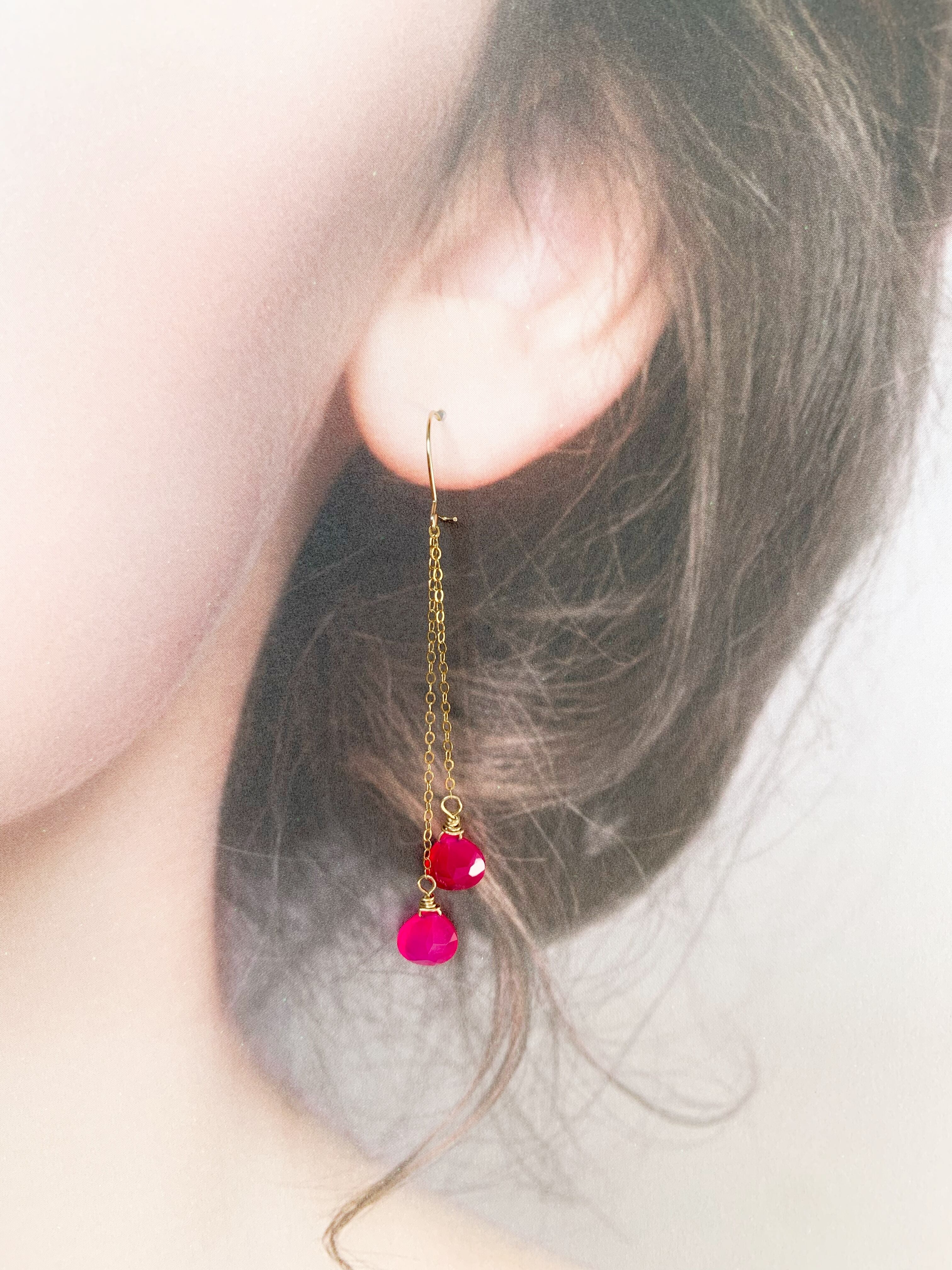 ビビットなピンク色が印象的で可愛らしいマロンファセットカットのピンクカルセドニーは、ほんのりとした透明感とグラデーションがあり、小ぶりなカルセドニーと揺れ動くデザインにすることで女性らしさを引き立ててくれるピアスになっております。
